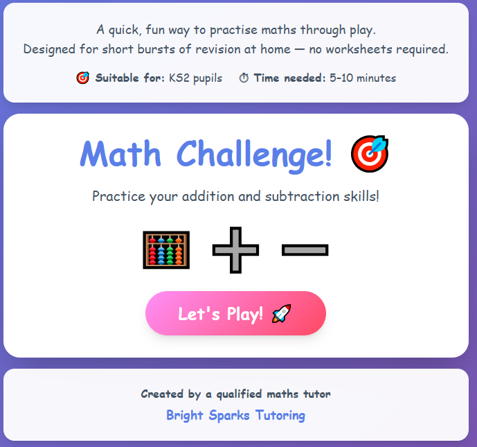 These free online maths games help children practise key skills in a fun, engaging way. Designed for KS2, KS3 and GCSE students, each game encourages confidence, independence and positive learning habits. It just take 5 - 10 minutes for each game.